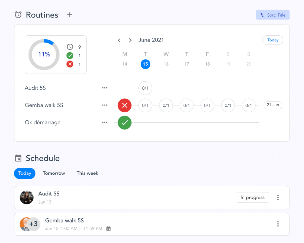 Visualization of routine indicators (score, status, % completion) also allows you to see at a glance any performance gaps or Andon-type anomalies and provide a quick response via an action plan or by escalating the information to the next level.