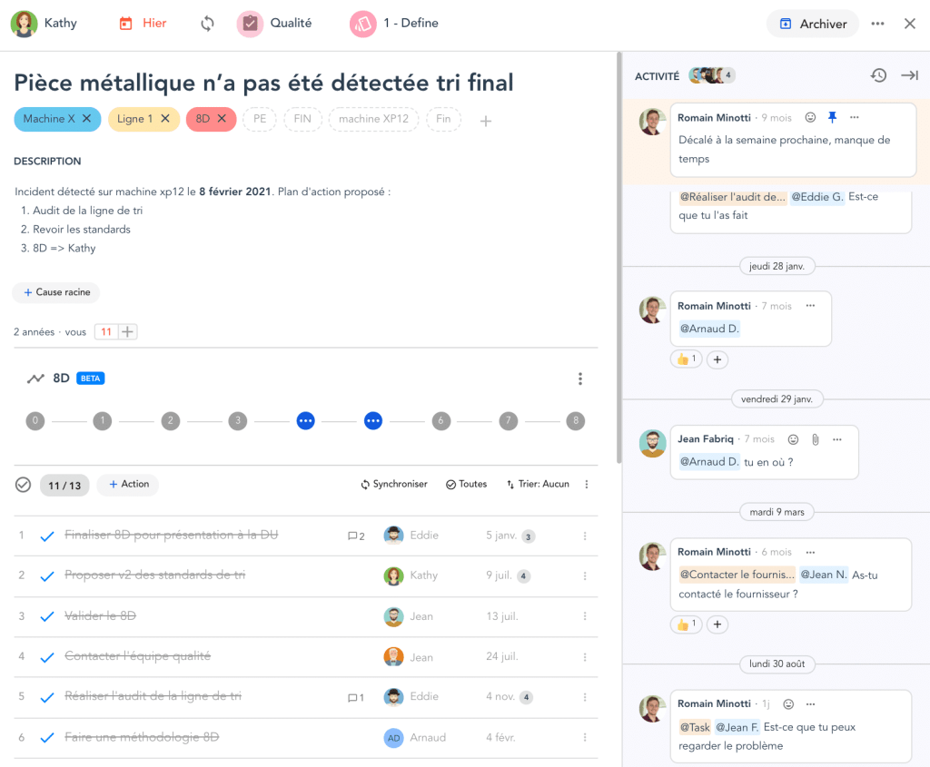 Let’s take the example of an employee who detects a quality issue: machine X can no longer detect a part and has stopped production. The operator can create a ticket, describe the situation, set a processing deadline and share it with the people concerned by the technical problem in order to speed up its resolution.