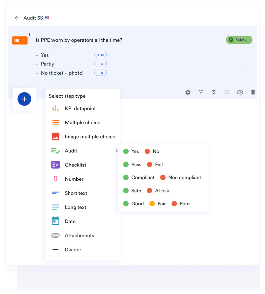 5S audits are systematic evaluations of how a manufacturing unit complies with the 5S methodology, which stands for Sort, Straighten, Shine, Standardize and Sustain. A 5S audit could look like: