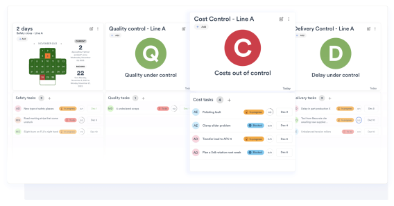 Crea le tue dashboard utilizzando widget personalizzabili che rispondo ai tuo standard di Visual Management. Visualizza tutte le informazioni di cui hai bisogno per le tue riunioni di valutazione delle prestazioni in interfacce dinamiche: indicatori di performance, Pareto, piani d’azione, routine, comunicazioni, passaggi di consegne o analisi.